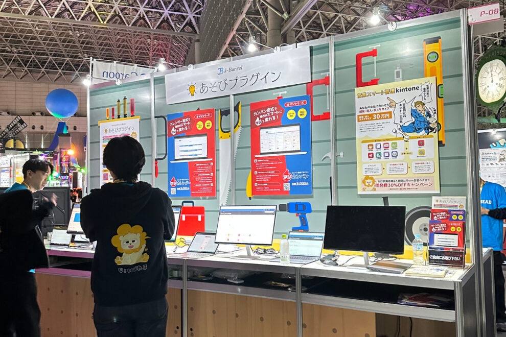 株式会社J-Barrelのブースでは、Cybozu Days2024年に引き続き「あそびプラグイン」、本気でプラグイン開発をした「マジシリーズ」、パッケージをベースにコストを抑えたkintone開発プラン「営業スマート管理kintone」の3つをご紹介させていただきました。