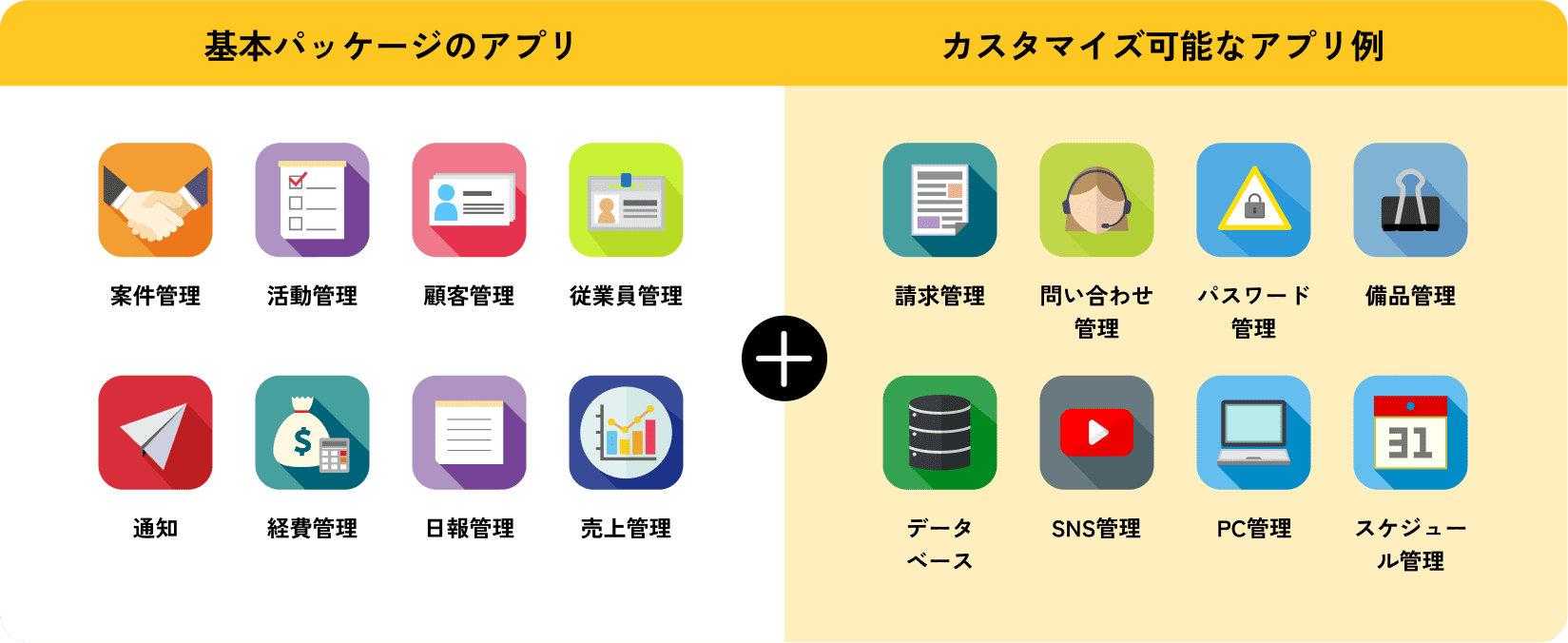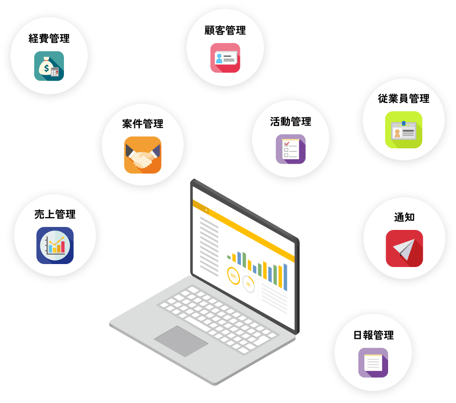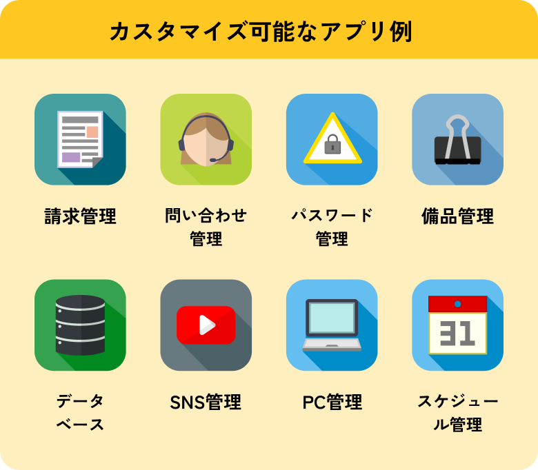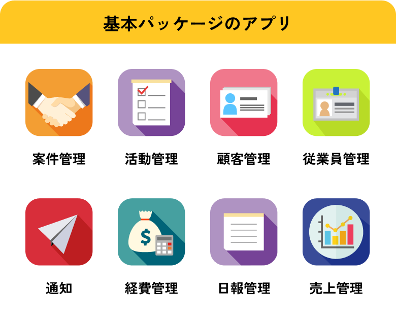 営業管理・顧客管理・日報管理など、企業によくある機能はあらかじめ開発済み。