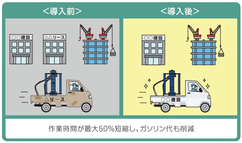| 成果 | リース店への往復などの無駄な時間がなくなり、作業効率が最大50%向上。移動時間やガソリン代も削減 |