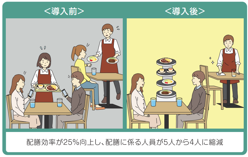 | 成果 | 5人必要だった配膳業務が4人でできるようになり(20%削減)、空いた時間で顧客への目配りが向上 |