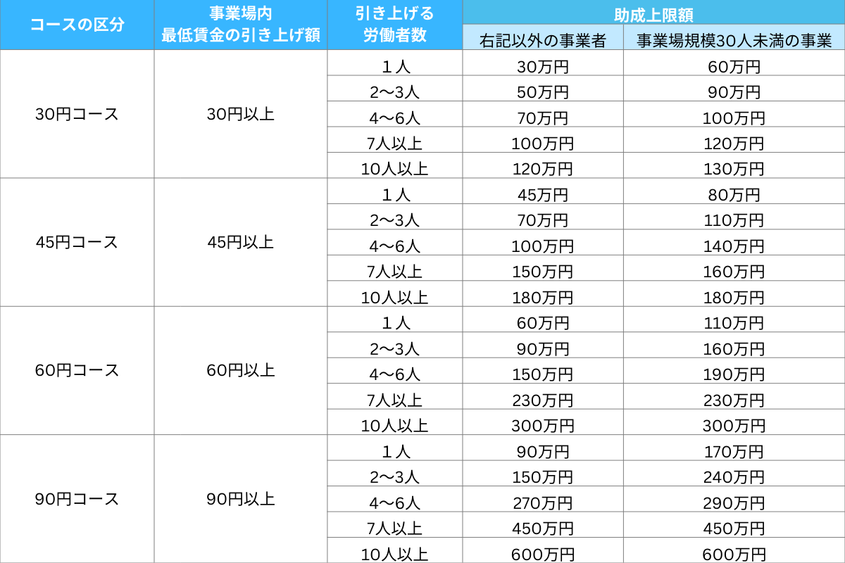 引き上げる金額や人数が多いほど、助成金の金額も大きくなります。
